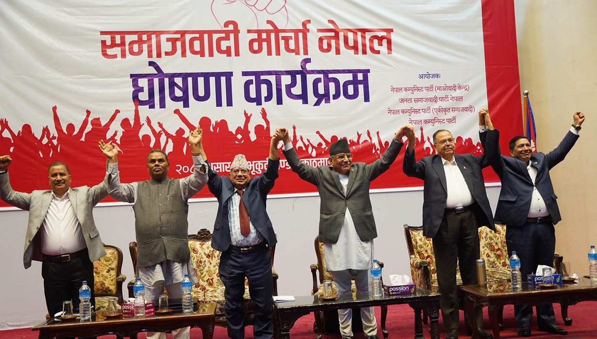 ४ असार, काठमाडौं । सरकारको नेतृत्वकर्ता माओवादी केन्द्रसहित चार दलले समाजवादी मोर्चा घोषणा गरेका छन् । राष्ट्रियसभा गृहमा आयोजित कार्यक्रममा चार दलका प्रमुखहरुले ७ बुँदे घोषणापत्रमा हस्ताक्षर गरे । लगतै नेताहरुले हालेमालो गरेर खुसी साटे ।