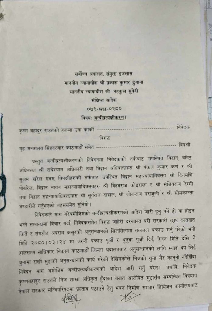 थुनामा परेका सञ्चार सचिव कृष्णबहादुर राउतको हकमा मात्रै सर्वोच्चले दुई पेजको संक्षिप्त आदेश गर्यो । त्यही आदेशमा समेत बिवादको गाँठो ‘हदम्याद’को विषय उल्लेख छैन । बरु ‘राउतलाई पक्राउ नगरी गरिएको अनुसन्धान प्रभावकारी नहुने’ भन्ने प्रहरीको जिकिरमा सहमत नभएर अदालतले उनलाई थुनामुक्त गर्नुपर्ने दृष्टिकोण अघि सारेको देखिन्छ ।