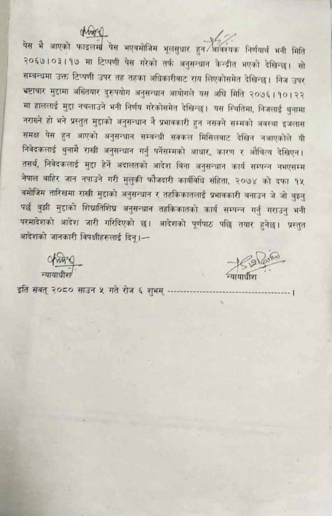 अख्तियारले समेत उनीविरुद्ध मुद्दा नचलाउने निर्णय गरेको भन्दै सर्वोच्च अदालतले संक्षिप्त आदेशमा भनेको छ, ‘निजलाई थुनामा नराख्ने हो भने मुद्दाको अनुसन्धान नै प्रभावकारी हुन नसक्नेसम्मको अवस्था देखिन नआएकोले थुनामै राखी अनुसन्धान गर्नुपर्नेसम्मको आधार, कारण र औचित्य देखिएन ।’ सर्वोच्चले उनलाई जिल्ला अदालतको अनुमतिविना नेपाल बाहिर जान नपाउने व्यवस्था मिलाउन आदेश गर्दै छिटो अनुसन्धानको काम सक्नु भनी प्रहरीलाई आदेश दिएको छ ।