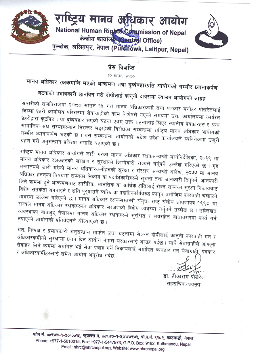 मंगलबार आयोगले विज्ञप्ति जारी गरी घटनाको निष्पक्ष र प्रभावकारी अनुसन्धान गर्न, दोषीलाई कानुनी कारवाही गर्न र मानव अधिकारकर्मी तथा पत्रकारको सुरक्षामा ध्यान दिन आग्रह गरेको छ ।