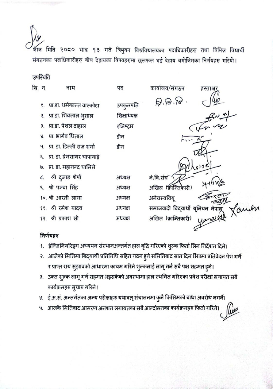 त्रिभुवन विश्वविद्यालयका उपकुलपति धर्मकान्त बाँस्कोटा र शिक्षाध्यक्ष शिवलाल भुसालसहितका पदाधिकारीले विभिन्न विद्यार्थी संगठनका प्रतिनिधिसँग बुधबार पाँच बुँदे सहमति गरेका छन् ।