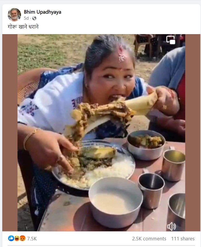 उजुरीपछि उपाध्यायले धरानकी भनेकी महिला चितवनकी रहेको खुल्यो। तर, यतिन्जेल उनले गर्दै नगरेको कामका लागि चर्को आलोचना खेप्नुपरिसकेको थियो। ‘मेरो फोटोबारे यूट्यूब, टिकटक र फेसबूकमा आएका कमेन्ट निकै अत्यासलाग्दा थिए,’ गुरुङ भन्छिन्। उनका अनुसार त्यो फोटो दुई वर्षअघि तनहुँको देवघाट गाउँपालिका, पीपलटारमा आयोजित भोजमा खिचेर टिकटकमा हालिएको भिडिओको स्क्रीन शट हो। पास्नी भोजमा परम्परा अनुसार राँगोको सिङ्गो हड्डी सहितको मासु पकाइएको थियो।