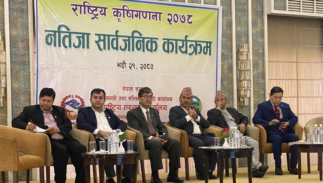 २१ भदौ, काठमाडौँ । राष्ट्रिय तथ्याङ्क कार्यालय (साविकको केन्द्रीय तथ्याङ्क विभाग)ले राष्ट्रिय कृषिगणना, २०७८ को नतिजा आज सार्वजनिक गरेको छ ।