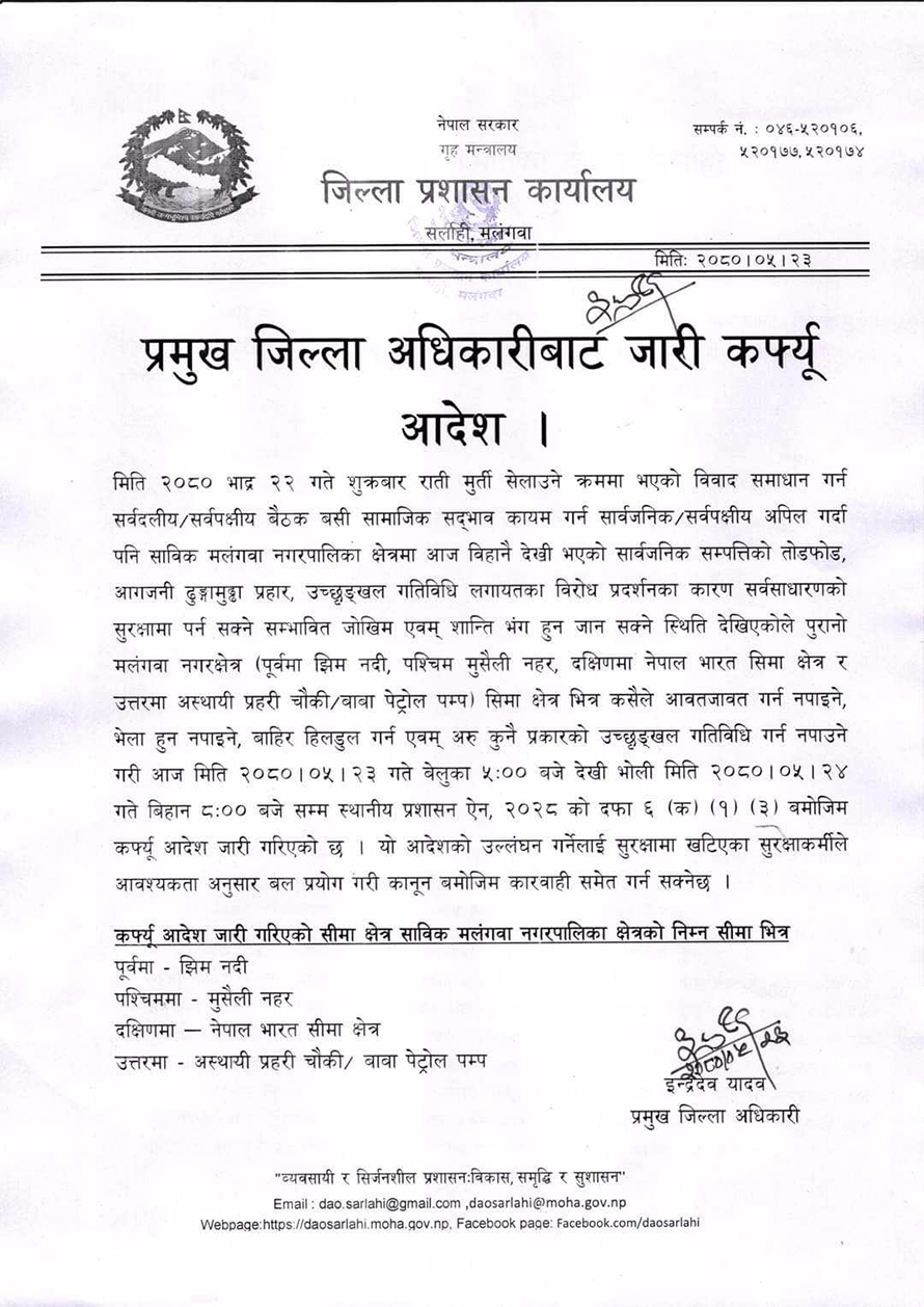 २३ भदौ, काठमाडौं । जिल्ला प्रशासन कार्यालय सर्लाहीले सदरमुकाम मलंगवा क्षेत्रमा कर्फ्यू आदेश जारी गरेको छ ।