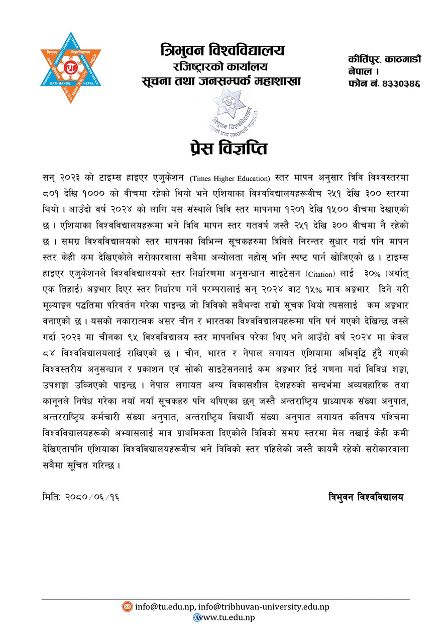 टाइम्स हायर एजुकेसनको सर्वेक्षणमा आफ्नो स्तर खस्किएपछि त्रिविले आफ्नो बलियो पक्षमा अंकभार कम राखिएका कारण वरीयतामा तल परेको स्पष्टीकरण दिएको छ ।