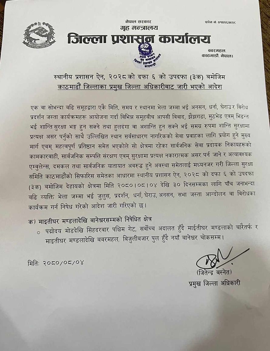 प्रशासनको निर्णय अनुसार, पद्यमोदय मोडदेखि सिंहदरबार पश्चिम गेट, सर्वोच्च अदालत हुँदै माइतीघर मण्डलाको चौरतर्फ निषेधित क्षेत्र घोषणा गरिएको छ । त्यस्तै, माइतीघर मण्डलादेखि बबरमहल, बिजुलीबजार पुल हुँदै नयाँ बानेश्वर चोकसम्म पनि निषेधित क्षेत्र घोषणा गरिएको छ ।