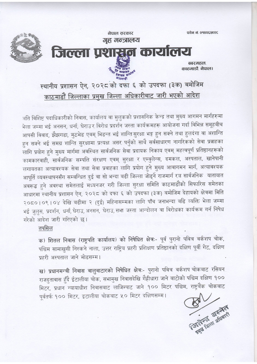 काठमाडौंका प्रमुख जिल्ला अधिकारी जितेन्द्र बस्नेतले अति विशिष्ट पदाधिकारीको निवास, कार्यालय वा मुलुकको प्रशासनिक केन्द्र तथा मुख्य आगमन मार्गहरुमा भेला भई अनशन, धर्ना घेराउ र विरोध प्रदर्शन गरिएकााले त्यस्ता काम गर्न रोक लगाएको उल्लेख गरेका छन् ।