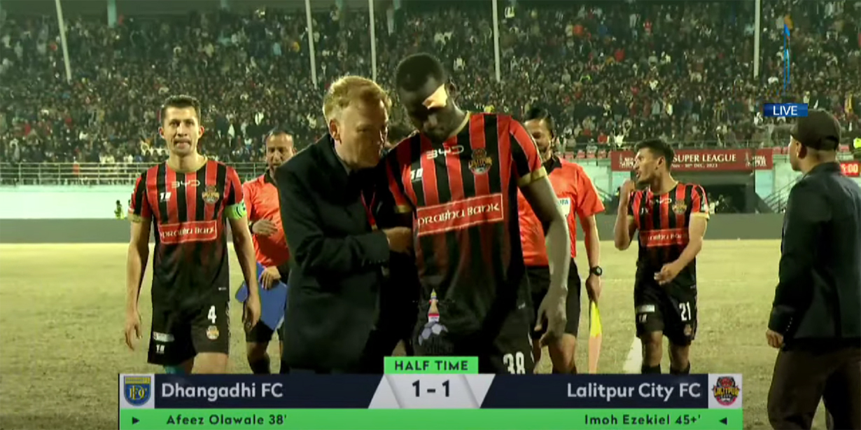 फाइनल खेलको पहिलो हाफमा दुवै टोलीले एक एक गोल गरेका छन् । दुवै टिमका विदेशी खेलाडीले गोल गरे । धनगढीले पहिले अग्रता दिलाएपनि इन्जुरी टाइमको अन्तिममा ललितपुरले बराबरी गोल फर्काएको हो । अब दोस्रो हाफमा कसले गोल गर्ला ? त्यो हेर्न बाँकी छ ।