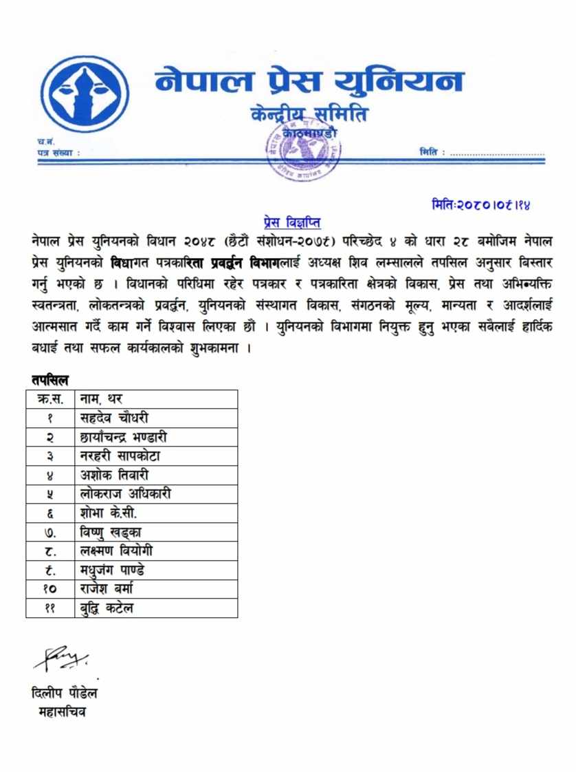 युनियनका केन्द्रीय उपाध्यक्ष जीवन भण्डारीको संयोजकत्वमा विभिन्न विधा (विट)मा क्रियाशिल पत्रकारहरुलाई समेटेर युनियनले विभाग गठन गरेको महासचिव दिलिप पौडेलद्धारा जारी वक्तव्यमा उल्लेख छ ।