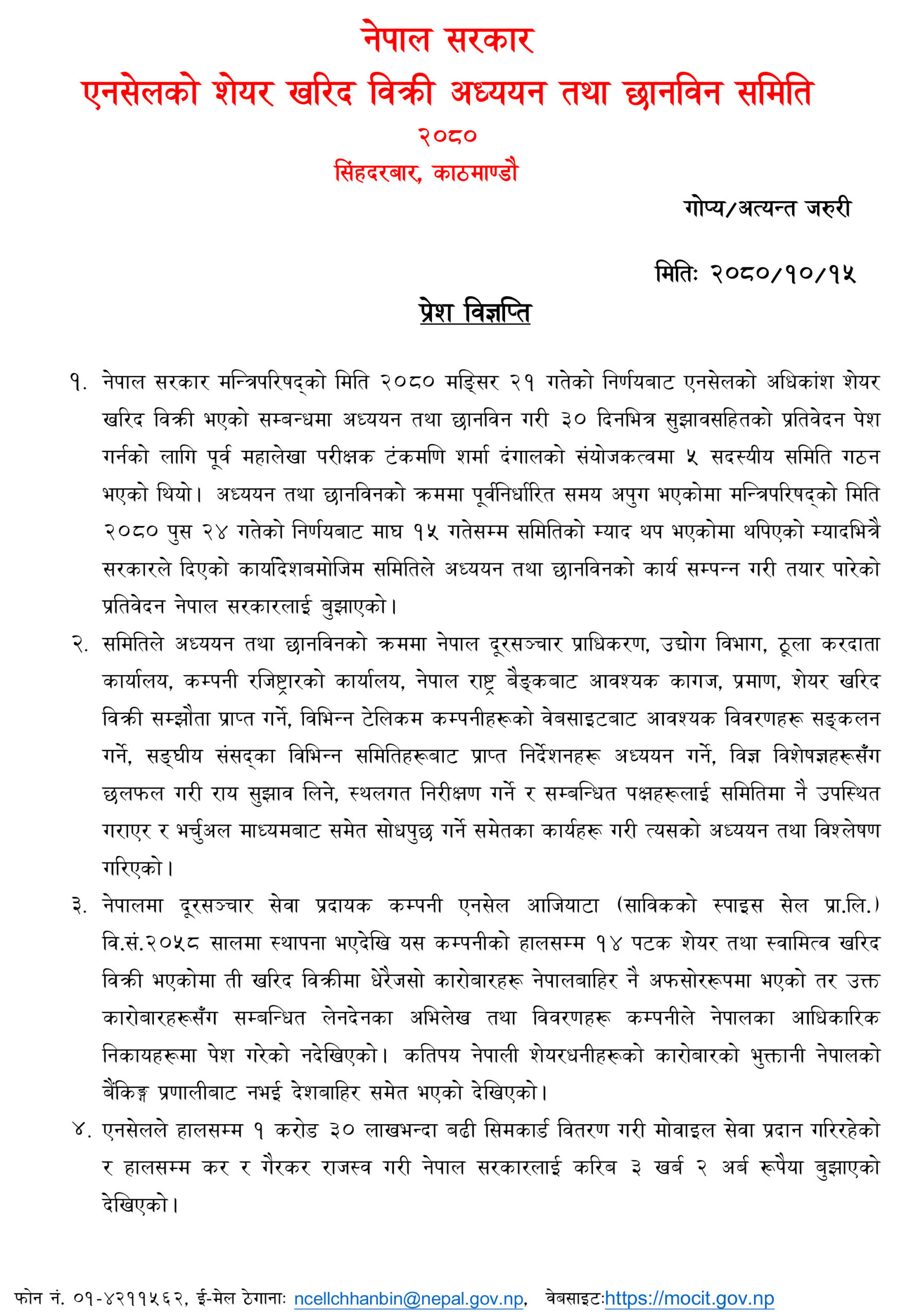 १५ माघ, काठमाडौं । एनसेल शेयर खरिदबिक्रीमा अध्ययन गर्न बनेको समितिले थप छानबिन हुनुपर्ने निष्कर्षसहित प्रधानमन्त्रीलाई प्रतिवेदन बुझाएको छ ।