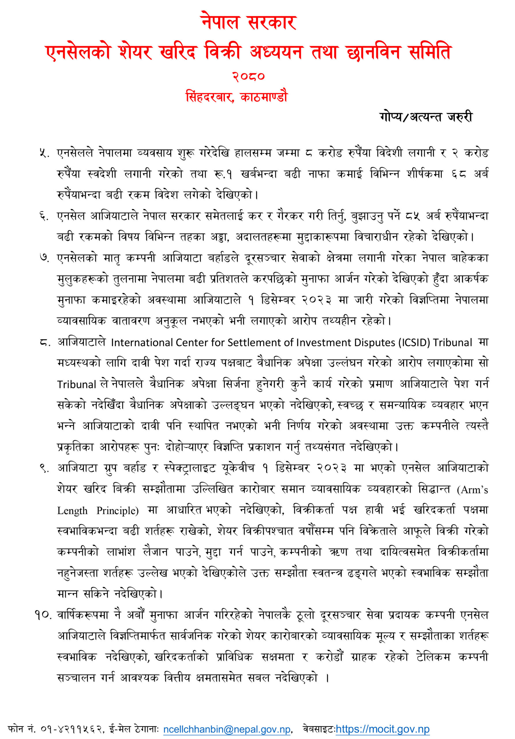 निवर्तमान महालेखापरिक्षक शर्मा नेतृत्वको पाँच सदस्यीय समितिले सोमबार प्रधानमन्त्री पुष्पकमल दाहाल प्रचण्डलाई प्रतिवेदन बुझाएको हो, जसमा पटकपटक एनसेलको शेयर खरिदबिक्री हुँदा राज्यका कतिपय निकायहरुले आफ्नो जिम्मेवारी पालना नगरेकाले थप छानबिन गर्न सिफारिस गरिएको छ ।