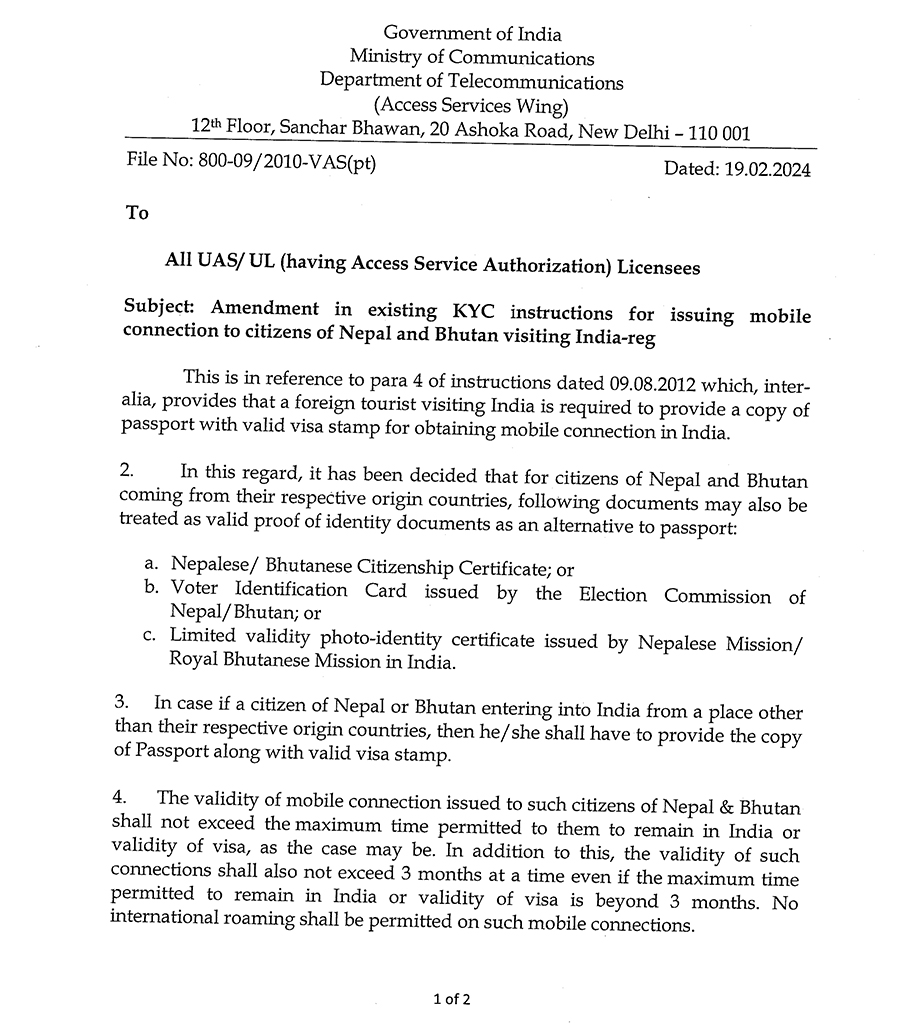 भारतको सञ्चार मन्त्रालयले पनि सूचना जारी गरी नेपाली र भुटानी नागरिकहरुलाई भारतीय सिमकार्ड उपलब्ध गराउने निर्णय भएको जानकारी गराएको छ ।