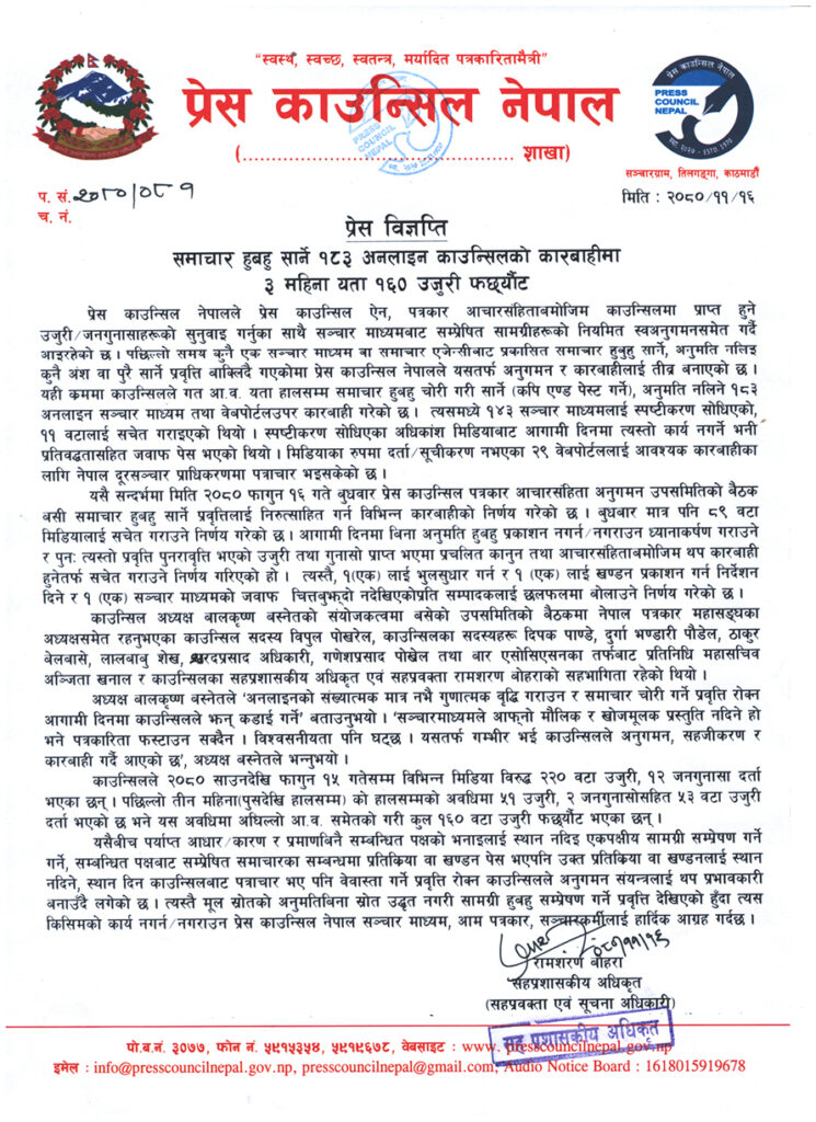 काउन्सिलले बुधबार एक विज्ञप्ति जारी गर्दै गत आ.व. यता हालसम्म समाचार हुबहु चोरी गरी सार्ने (कपि एण्ड पेस्ट गर्ने), अनुमति नलिने १८३ अनलाइन सञ्चार माध्यम तथा वेबपोर्टललाई कारबाही गरेको जनाएको हो ।