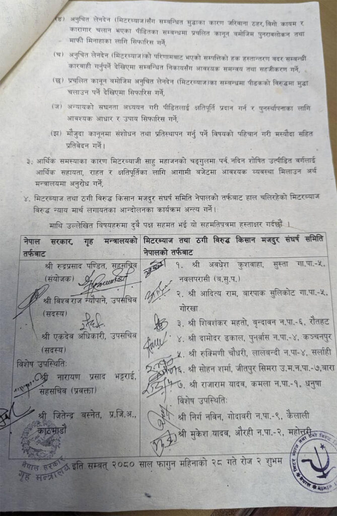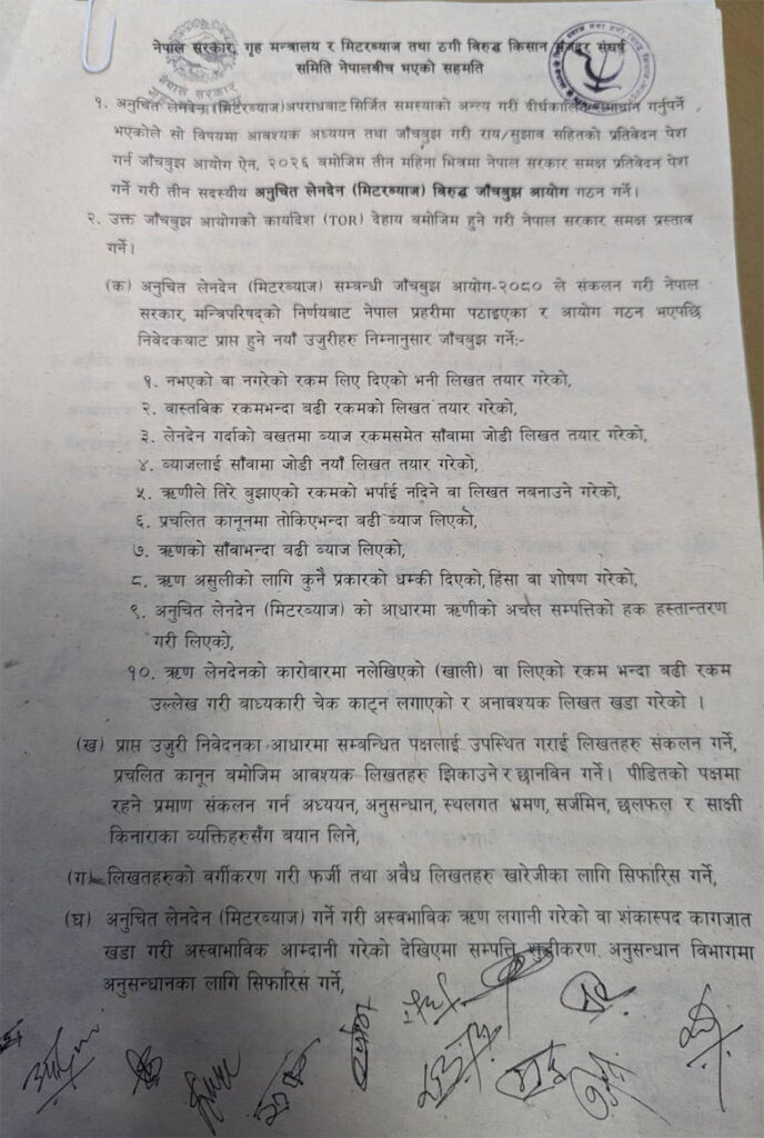 गृह मन्त्रालयमा सोमबार भएको वार्तामा मिटरब्याज पीडितको समस्या समाधानका लागि फेरि तीन महिनाभित्र जाँचबुझ आयोग गठन गर्ने सहमति भएको छ ।