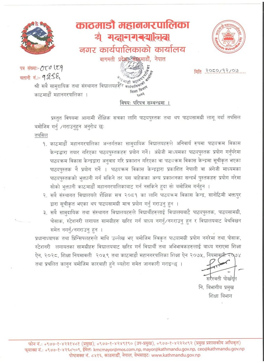 हेर्नुहोस् महानगरपालिकाको शिक्षा विभागले जारी गरेको परिपत्र :