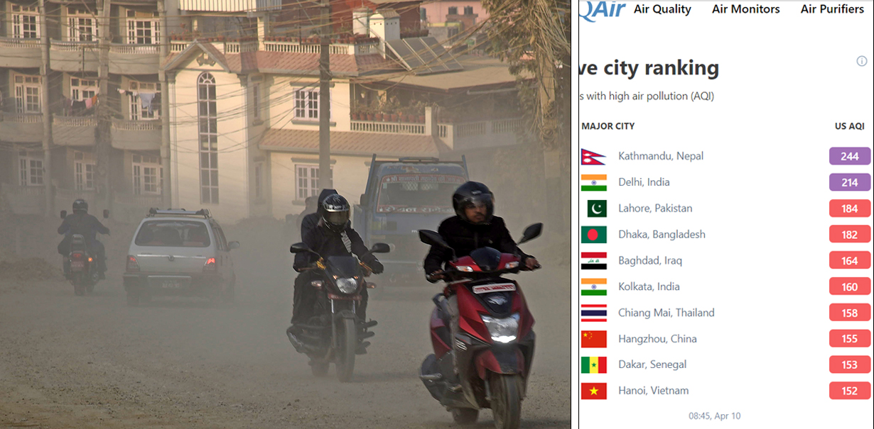 आईक्यू एयरका अनुसार काठमाडौंको एयर क्वालिटी इन्डेक्स (एक्युआई) २४१ छ । पाकिस्तानको लाहोरको २०६ र भारतको नयाँदिल्लीको २०४ एक्युआई छ । एक्युआई २०० भन्दा माथि पुग्नुलाई अत्यन्तै अस्वस्थकर मानिन्छ । यस्तो अवस्थामा मानिसहरुलाई घरबाट ननिस्किन सुझाव दिने गरिन्छ ।