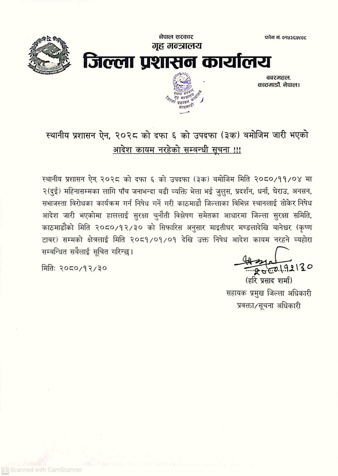 साथै सरकारी एवं सार्वजनिक सम्पत्ति र व्यक्तिगत हानी नोक्सानी पुर्याए स्थानीय प्रशासन ऐन अनुसार कारबाही गर्ने बताएको छ ।