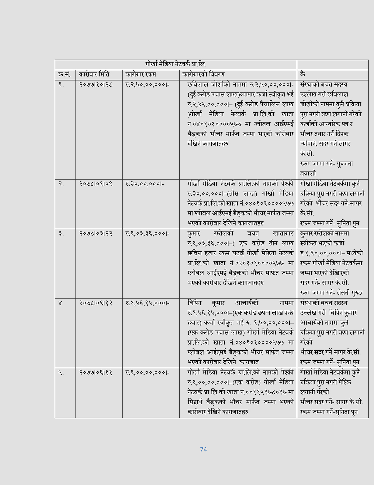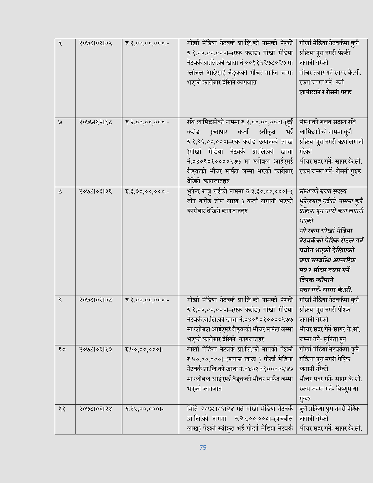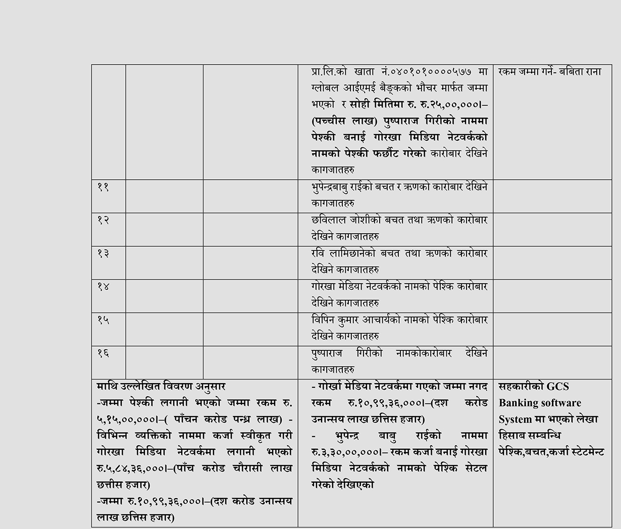 ३ वैशाख, काठमाडौं । बुटवलको सुप्रिम बचत ऋण सहकारीको १४ करोड २९ लाख रुपैयाँ भन्दा बढी रकम गोर्खा मिडिया नेटवर्क प्रालिमा लगानी भएको पाइएको छ । यसमध्ये २ करोड रुपैयाँ प्रक्रिया पूरा नगरी रवि लामिछानेको नाममा ऋण लिएको पाइएको छ ।