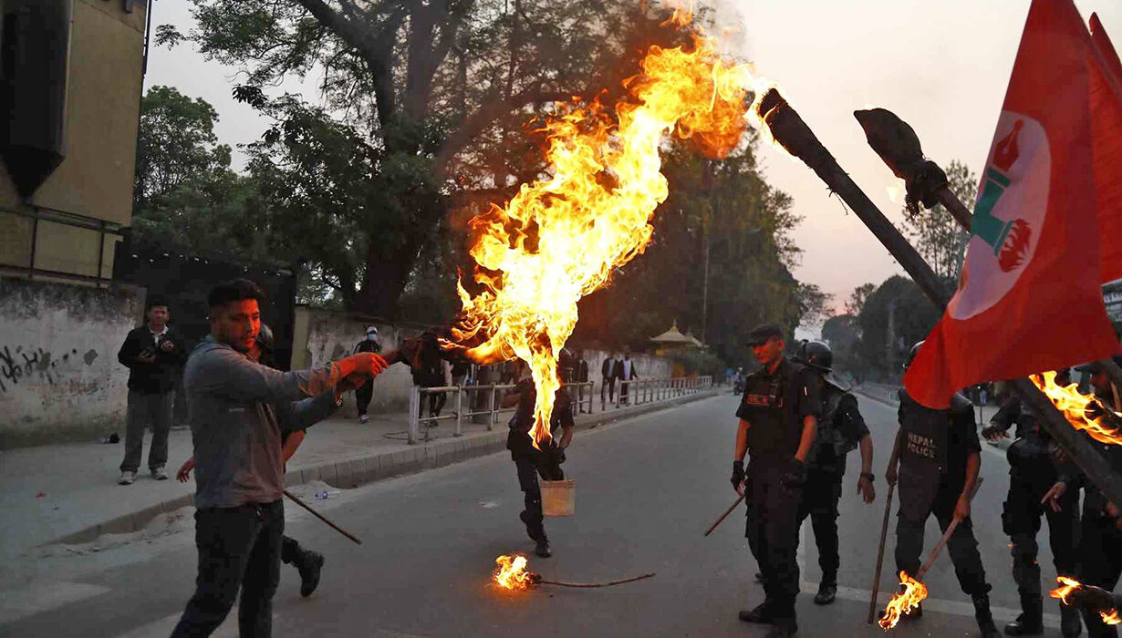 काठमाडौंको प्रदर्शनीमार्गस्थित रत्नराज्य लक्ष्मी क्याम्पसबाहिर नेविसंघका कार्यकर्ताहरुले गृहमन्त्रीको पुत्ला दहन गरेका हुन् ।