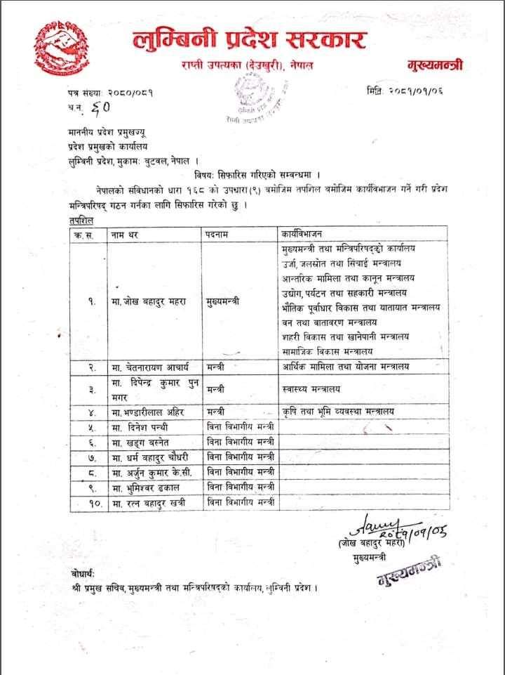 एमाले स्रोतका अनुसार ढकालले सहकारी विकास, पन्थीले गृह, केसीले वन र खत्रीले सामाजिक विकास मन्त्रीको जिम्मेवारी पाउने छन् । चैत २३ मा मुख्यमन्त्री नियुक्त भएका माओवादी केन्द्रका जोखबहादुर महराले नेकपा एमाले, नेकपा माओवादी केन्द्र र जनता समाजवादी पार्टीबाट एक/एक जना मन्त्री बनाइसकेका छन् ।