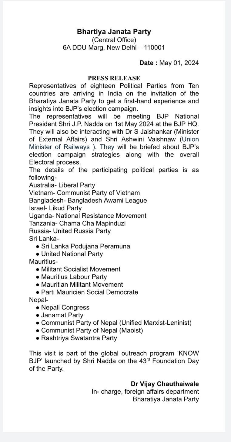 भाजपाका विदेश विभाग इन्चार्ज डा. बिजय चौथाइवालेले आज जारी गरेको विज्ञप्तिमा नेपालका पाँच दललाई समेत निम्ता गरिएको उल्लेख छ । प्रमुख दल नेपाली कांग्रेस, सत्तारुढ दल नेकपा एमाले, नेकपा माओवादी केन्द्र, राष्ट्रिय स्वतन्त्र पार्टी र जनमत पार्टीलाई आमन्त्रण गरेको हो भने यी दलका प्रतिनिधिलाई बिजेपी मुख्यालयमा आज उपस्थित हुन भनिएको छ ।