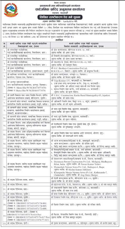 २७ वैशाख, काठमाडौं । प्रधानमन्त्री कार्यालय मातहतको सार्वजनिक खरिद अनुगमन कार्यालयले कार्यसम्पादन चित्तबुझ्दो नभएका २७ ठेकदार कम्पनी र आपूर्तिकर्तालाई कालोसूचीमा राख्ने प्रक्रिया अगाडि बढाएको छ ।