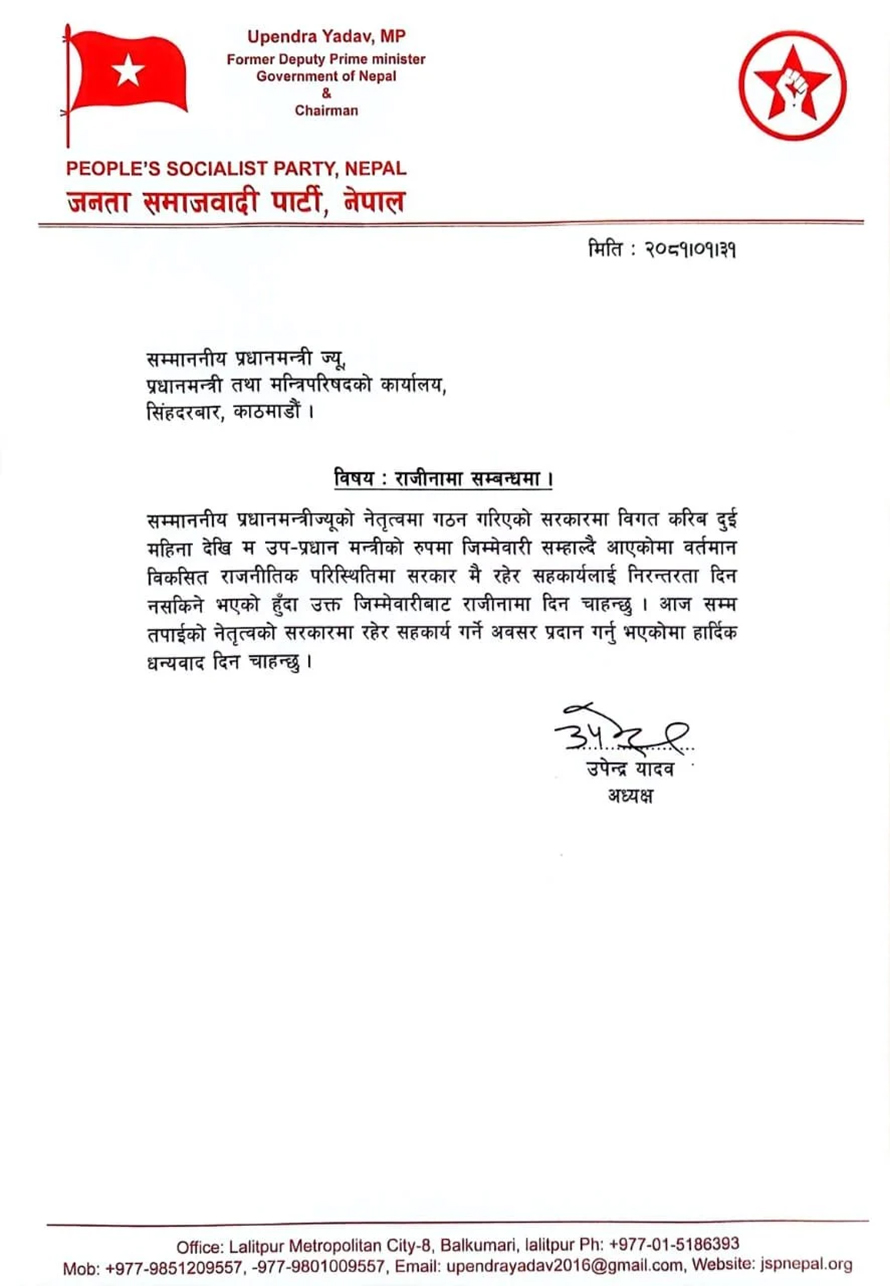 ३१ वैशाख, काठमाडौं । उपप्रधान तथा स्वास्थ्य मन्त्री उपेन्द्र यादवले राजीनामा दिएका छन् । उनले सोमबार प्रधानमन्त्रीलाई सम्बोधन गर्दै राजीनामा पत्र पठाएका हुन् ।