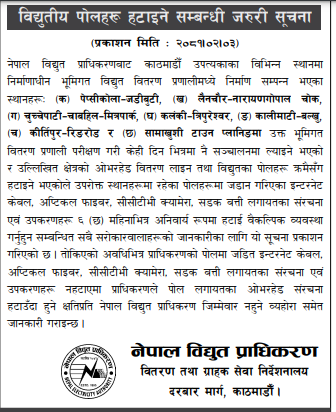 उल्लेखित क्षेत्रको ओभरहेड वितरण लाइन तथा विद्युतका पोलहरु क्रमैसँग हटाइने भएकाले उपरोत्त स्थानमा भएका संरचना एवं उपकरणहरू नहटाएमा प्राधिकरणले पोललगायतका ओभरहेड संरचना हटाउँदा हुने क्षतिप्रति नेपाल विद्युत प्राधिकरण जिम्मेवारी नहुने व्यहोरोसमेत जानकारी गराइन्छ ।’