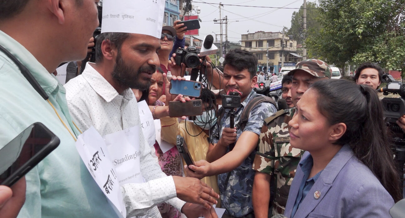 उनी माइतीघर मण्डलामा ‘शैक्षिक अवसर सबैलाई बराबर, गुणस्तरीय शिक्षाको आधार इसीडी शिक्षामा सुधार’लगायतका नारासहितको प्लेकार्ड लिएर विद्यार्थी र शिक्षकहरूको हकहितका निम्ती उभिएर बिरोध गरिरहेका छन् ।