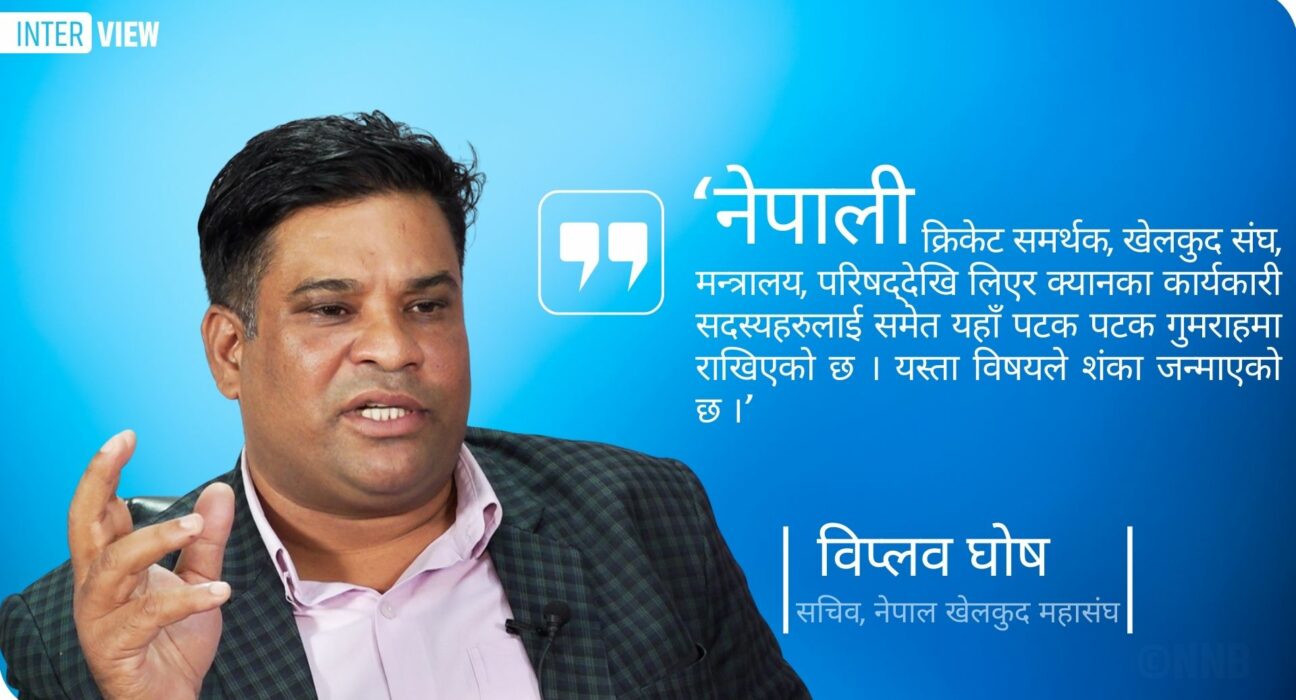 ३० जेठ , काठमाडौँ । सुनसरीका विप्लव घोष करातेका पूर्वखेलाडी हुन् । नेपाली खेलकुदको विकास र खेलाडीको प्रोत्साहनमा सक्रिय उनी पछिल्लो समय एक दिवसीय क्रिकेट प्रतियोगिताहरुको आयोजना गरेर बढी चर्चामा छन् । नेपाल खेलकुद महासंघको सचिवसमेत रहेका उनले नेपाल क्रिकेट संघ(क्यान) भित्र देखिएको बेथितिविरुद्ध आवाज उठाउँदै आएका छन् । साथै खेलकुद क्षेत्रलाई बजेट विनियोजनमा सरकारले उपेक्षा गरेकोप्रति आपत्ति पनि प्रकट गरिरहेका छन् । सचिव घोषसँग नेपाली खेलकुदको विकास, क्यानभित्र देखिएको विवाद र भावी रणनीतिका विषयमा नेपाल न्यूज बैंकले कुराकानी गरेको छ ।