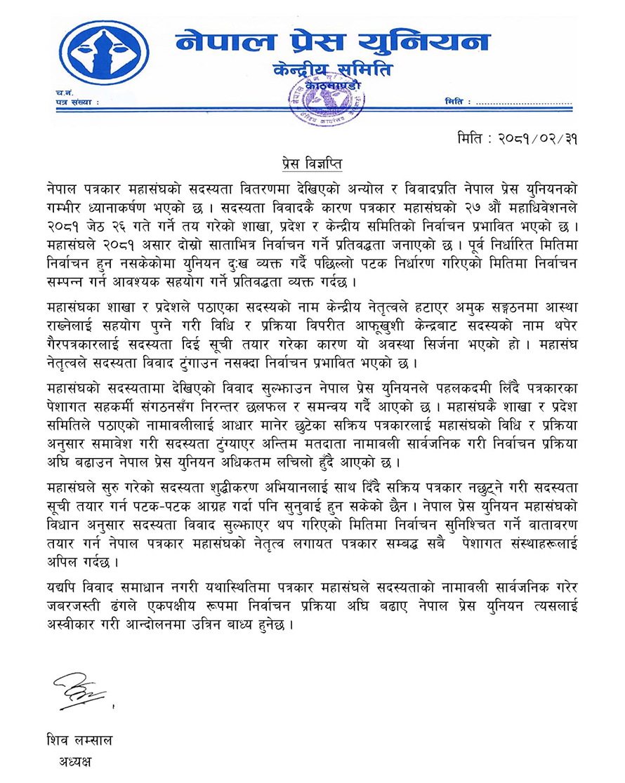 सदस्यताको विवाद समाधान नगरी सदस्यताको नामावली सार्वजनिक गरेर जबरजस्ती ढंगले एकपक्षीय रूपमा निर्वाचन प्रक्रिया अघि बढाए अस्वीकार गरेर आन्दोलनमा जाने प्रेस युनियनले घोषणा गरेको छ ।