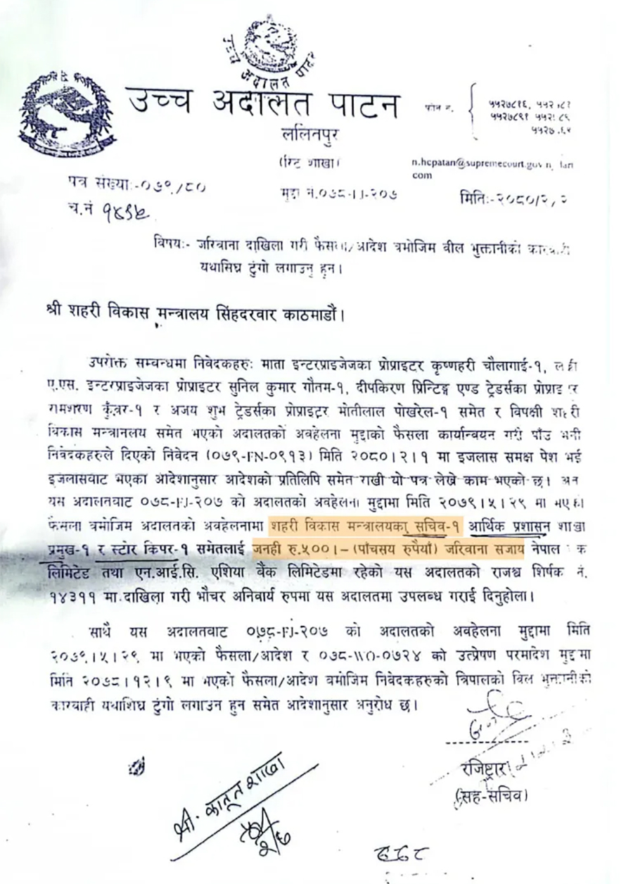 उच्च अदालत पाटनले आदेश कार्यान्यवयन नभएको भन्दै २०८० जेठ २ गते शहरी विकास मन्त्रालयलाई पत्र लेखेर ताकेतासमेत गरेको थियो ।