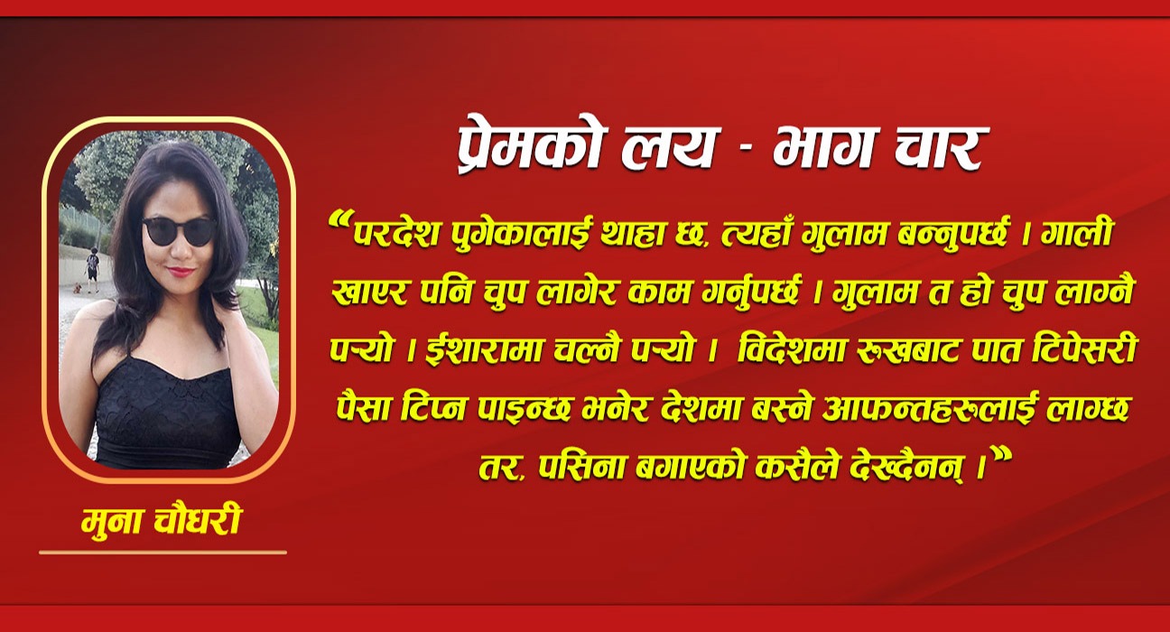 परदेश कस्तो शब्द रहेछ । परको देश । टाढाको देश । सुन्दा जाउजाउ लाग्ने । मनै रमाउने । केके पाउँछु लाग्ने । रमाइलो लाग्ने, सुखको कल्पना हुने । सुख पाइन्छ भन्ने सोच आउने । सुविधा भोग्छु भन्ने आसा जाग्ने । डलरे जीवन बिताउछु भन्ने अनुभव हुने । सामन्त बन्छु भन्ने घमन्ड जाग्ने । विदेश बस्छु भनेर अहम आउने तर यहाँ आएपछि वास्तविकता थाहा हुन्छ । गुलाम बन्नुपर्छ । गाली खाएर चुप लागेर काम गर्नुपर्छ । गुलाम त हो चुप लाग्नै प¥यो । ईशारामा चल्नै प¥यो । नत्र काम खोसिने भय हुन्छ । फर्काएर जवाफ दिन सकिँदैन । गाँस खोसिन्छ । विदेशमा रुखबाट पात टिपेसरी पैसा टिप्न पाइन्छ भनेर देशमा बस्ने आफन्तहरुलाई लाग्छ तर, पसिना बगाएको कसैले देख्दैनन् ।