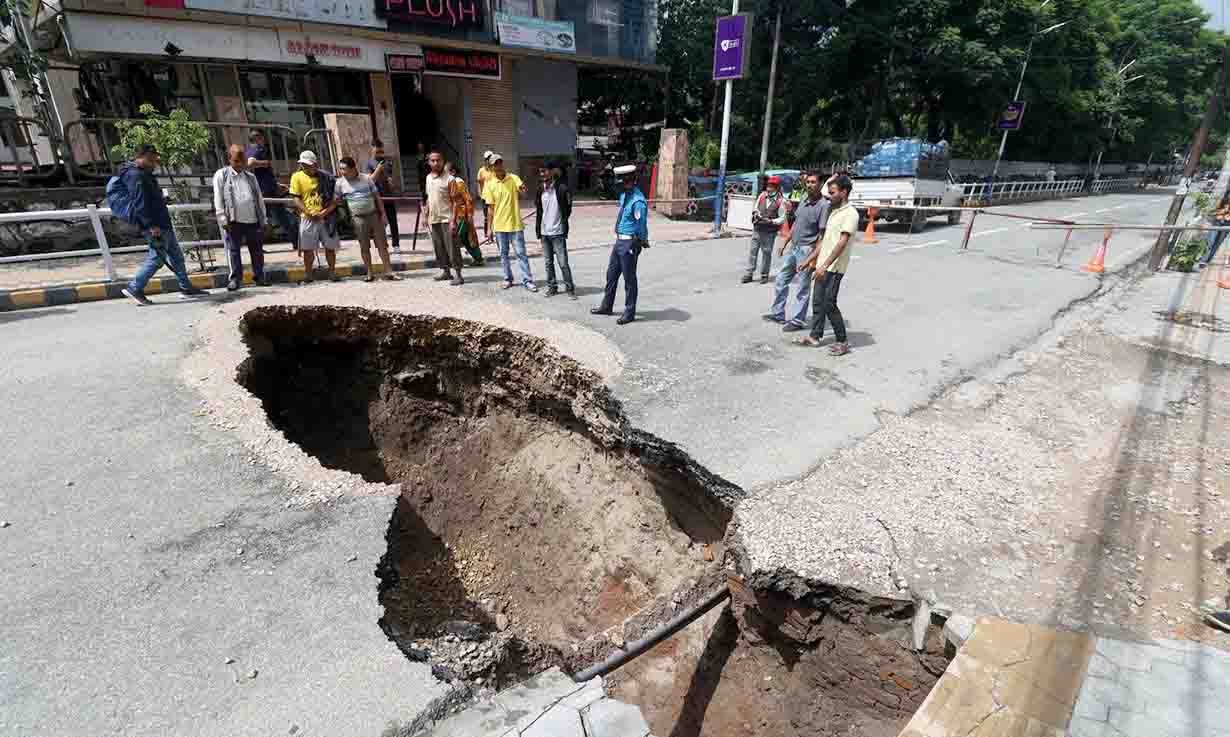 २५ साउन, काठमाडौं । काठमाडौं महानगरपालिकाको नजिकको सडक भ्वाङ परेको छ । सडक भासिँदा रातिदेखि आवागमन पनि रोकिएको छ ।