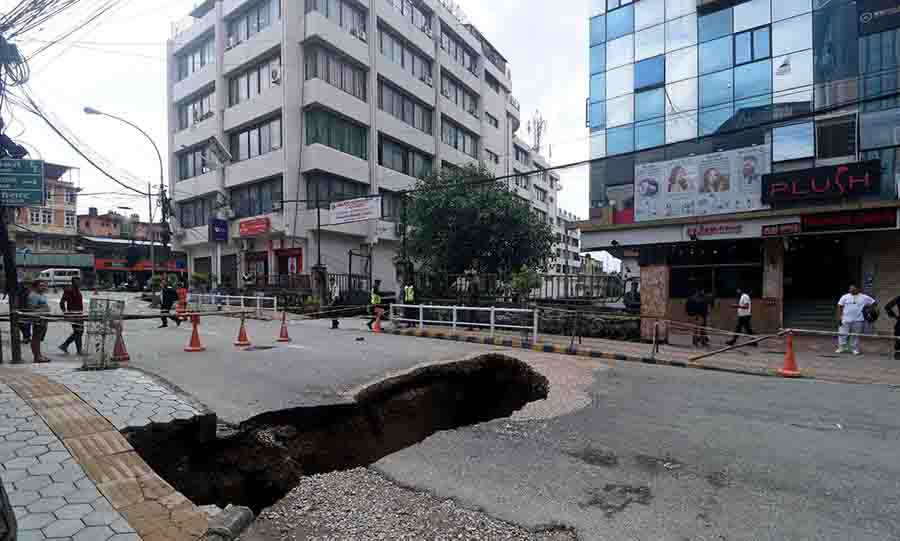 दरबारमार्गस्थित महेन्द्र सालिकबाट कमलादीको कृष्ण पाउरोटी चोक निस्किने सडक खण्ड भासिएको हो । यो सडक एकतर्फी छ । प्रहरीले घेरा हालेर राखेका छन् भने हिजो रातिदेखि सवारी चलाउन रोक लगाइएको छ ।