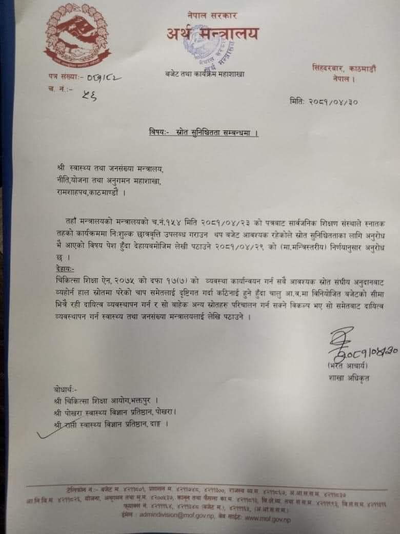 २ भदौ, काठमाडौं । पोखरा स्वास्थ्य विज्ञान प्रतिष्ठान पोखरा र राप्ती स्वास्थ्य विज्ञान प्रतिष्ठान दाङमा अब चिकित्सा शिक्षा अध्ययनअन्र्तगत एमबीबीएस अध्ययन शुरु गर्न बाटो खुलेको छ । नेपाल सरकार अन्र्तगतका दुवै प्रतिष्ठानमा एमबीबीएस पढाइ सञ्चालनका लागि अर्थ मन्त्रालयले श्रोत सुनिश्चिता गरेको छ । अर्थले यससम्बन्धी पत्र हालै मन्त्रालयलाई पठाएको छ ।