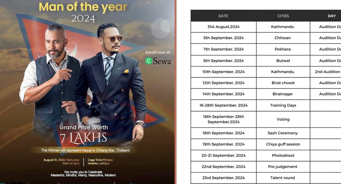 ६ भदौ, काठमाडौं । सात लाख रुपैयाँ धनराशिको पुरस्कार रहेको पुरूषहरूको सौन्दर्य प्रतियोगिता ‘म्यान अफ दि इयर २०२४’को अडिसन खुला भएको छ । आयोजक कम्पनी ‘यू क्यान फ्लाई फेशन प्रालि’ले उक्त प्रतियोगिताको अडिसन आह्वान गरेको हो ।