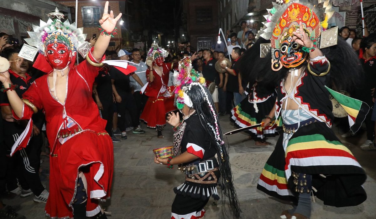 ९ भदौ, भक्तपुर । गाईजात्राको भोलिपल्ट रातिदेखि मध्यपुरथिमि नगरपालिकाभित्र फरक–फरक सहरमा तान्त्रिक विधि एवं दैवी शक्ति प्रकट गर्दै सञ्चालन भएका भैरव, महाकाली, निलबाराहीलगायतको देवीदेवता नाच आज बिहानबाट सम्पन्न भएको छ ।