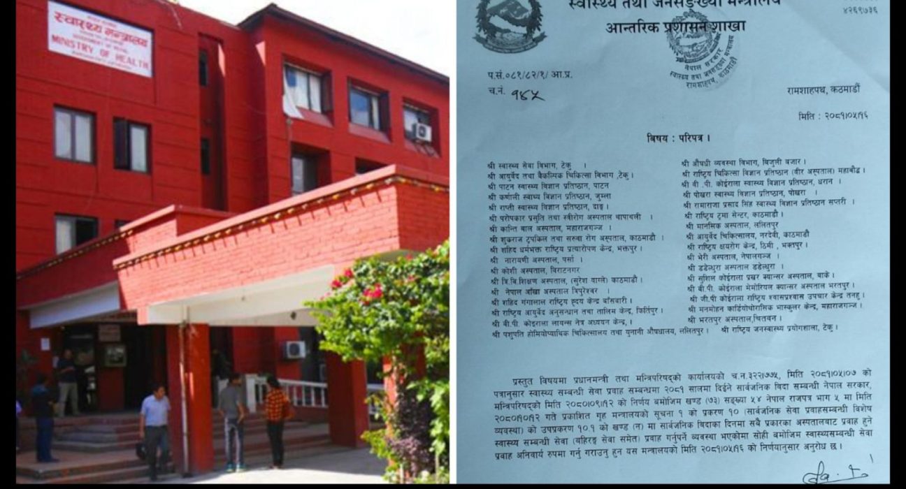 प्रधानमन्त्री तथा मन्त्रिपरिषद्को कार्यालयको च.न. ३२२७७५, मिति २०६१।०५।०७ को पत्रानुसार स्वास्थ्य सम्बन्धी सेवा प्रवाह सम्बन्धमा २०८१ सालमा दिईने सार्वजनिक विदा सम्बन्धी नेपाल सरकार, मन्त्रिपरिषद्को मिति २०६०।०९।१२ को निर्णय बमोजिम खण्ड (७३) सङ्ख्या ५४ नेपाल राजपत्र भाग ५ मा मिति २०८०१०११२ गते प्रकाशित गृह मन्त्रालयको सूचना १ को प्रकरण १० (सार्वजनिक सेवा प्रवाहसम्बन्धी विशेष व्यवस्था) को उपप्रकरण १०.१ को खण्ड (न) मा सार्वजनिक बिदाका दिनमा सबै प्रकारका अस्पतालबाट प्रवाह हुने स्वास्थ्य सम्बन्धी सेवा (बहिरङ्ग सेवा समेत) प्रवाह गर्नुपर्ने व्यवस्था भएकोमा सोही बमोजिम स्वास्थ्यसम्बन्धी सेवा प्रवाह अनिवार्य रुपमा गर्नु गराउनु हुन यस मन्त्रालयको मिति २०८१।०५।१६ को निर्णयानुसार अनुरोध छ । मन्त्रालयद्वारा जारी परिपत्रमा भनिएको छ ।