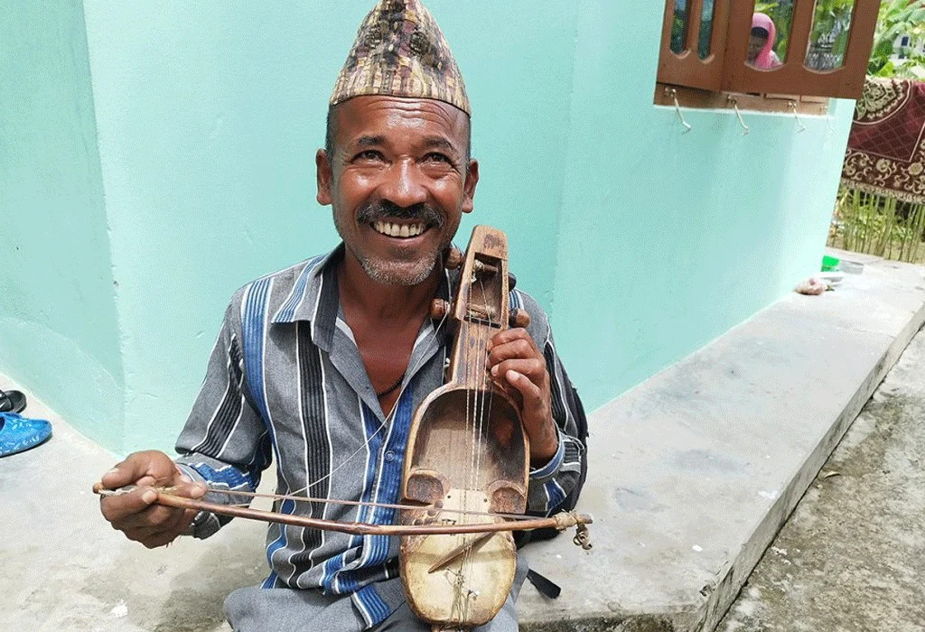 २३ भाद्र, देउखुरी (दाङ) । टालेको झुत्रो झोला, हातमा सारङ्गी । त्यही सारङ्गी रेट्दै घरघरमा मिठो धुन सुनाउँदै हिँडेका सल्यान खलङ्गाका ५५ वर्षीय लालबहादुर गन्धर्व हालै यहाँको घोराही बजार आइपुगेका छन् ।‘सारङ्गी रेटेर धुन बजाउँदै गीत गाउन थालेको ४० वर्षभन्दा धेरै भयो, सारङ्गी बजाउँदा आफू अझै जवान भएजस्तो लाग्छ, सारङ्गीको घुन निकालेपछि झन् जोशजाँगर बढेर आउँछ,’ उनी भन्छन्,’ ।
