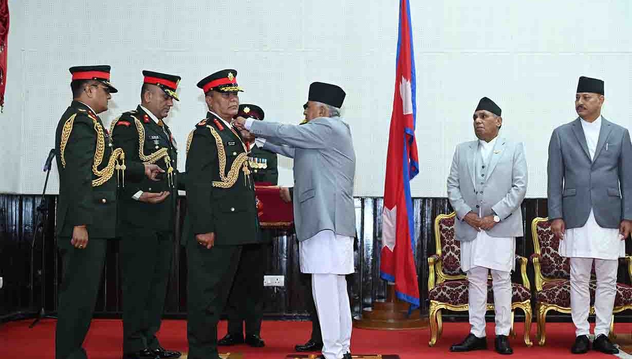 २४ भदौ, काठमाडौं । राष्ट्रपति रामचन्द्र पौडेलले नवनियुक्त प्रधानसेनापति महारथी अशोकराज सिग्देललाई नेपाली सेनाको प्रधानसेनापति पदको दर्ज्यानी चिन्ह प्रदान गरेका छन्।