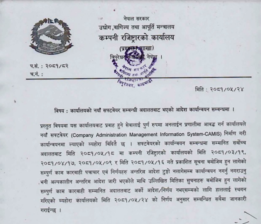 कार्यालयले कम्पनी दर्तालाई अनलाइन प्रक्रिया लैजाने गरी नयाँ सफ्टवेयर कार्यान्यनमा ल्याउन लागेको थियो । तर, यसकाविरुद्ध अदालतमा मुद्दा परेको थियो ।