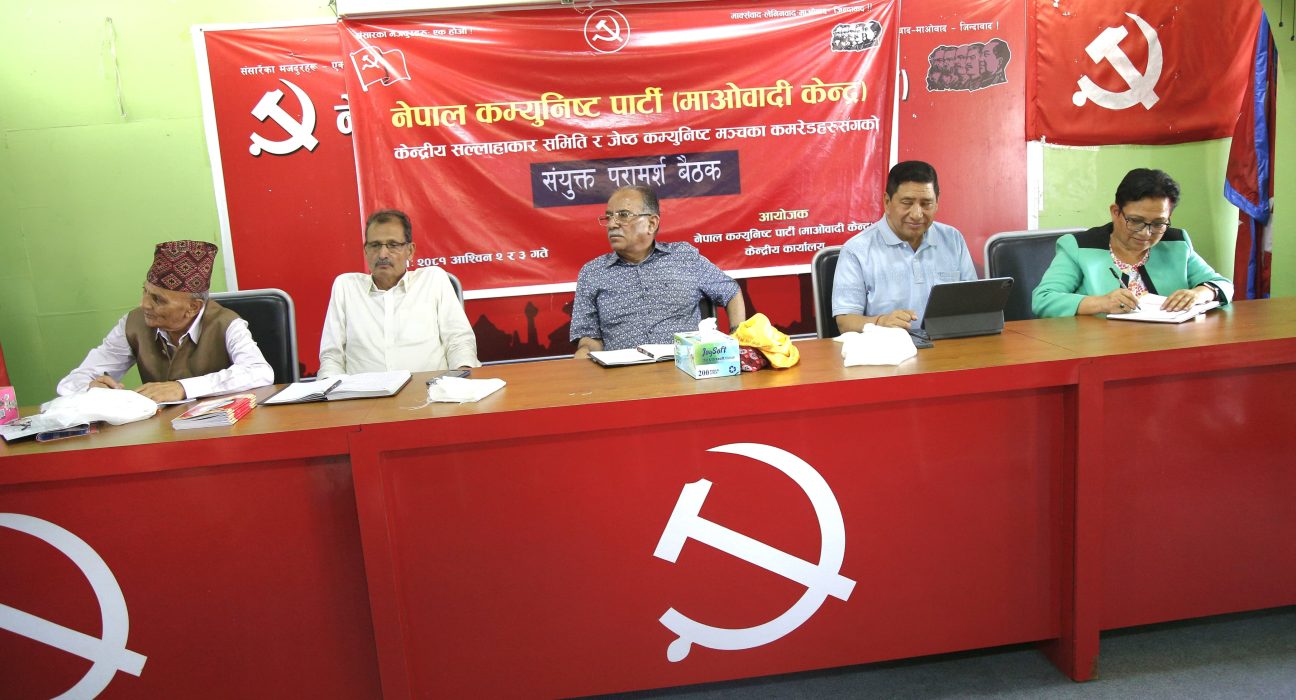 २ असोज, काठमाडौं । नेकपा माओवादी केन्द्रको केन्द्रीय सल्लाहकार समिति र ज्येष्ठ कम्युनिष्ट मञ्चको संयुक्त परामर्श बैठक पार्टी कार्यालय पेरिसडाँडामा सुरु भएको छ । बैठकमा पार्टीका केन्द्रीय पदाधिकारीका साथै केन्द्रीय सल्लाहकार समिति र ज्येष्ठ कम्युनिष्ट मञ्चका पदाधिकारी तथा सदस्यहरुको उपस्थिति रहेको छ ।
