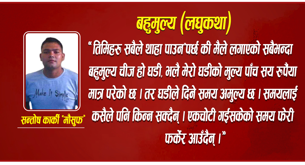 शिक्षकले मित्रवत स्वरमा भन्नुभयो: “तिमीहरू सबैले जान्नुपर्छ कि मैले लगाएको सबैभन्दा बहुमूल्य चीज मेरो टोपी, मेरो जुत्ता, वा मैले लगाको लेदरको बेल्ट होइन..यो मैले लगाको घडी हो। यो घडी पाँच सयको भएपनि यस घडिले समयको प्रतिनिधित्व गर्छ। हामीसँग समय अमूल्य छ किनकि जीवन छोटो छ अर्कोपल के हुन्छ हामीलाई थाहा हुँदैन। हामीलाई थाहा छ पैसा कति सन्तुलित छ, तर हामीलाई थाहा छैन कि हाम्रो जीवनमा समय कति सन्तुलित छ भनेर। हराको वा खेर गएको पैसा फ़ेरि कमाउन सकिन्छ तर गएको समय सधैंको लागि जान्छ, हामीले यसलाई कहिल्यै फिर्ता पाउन सक्दैनौं।