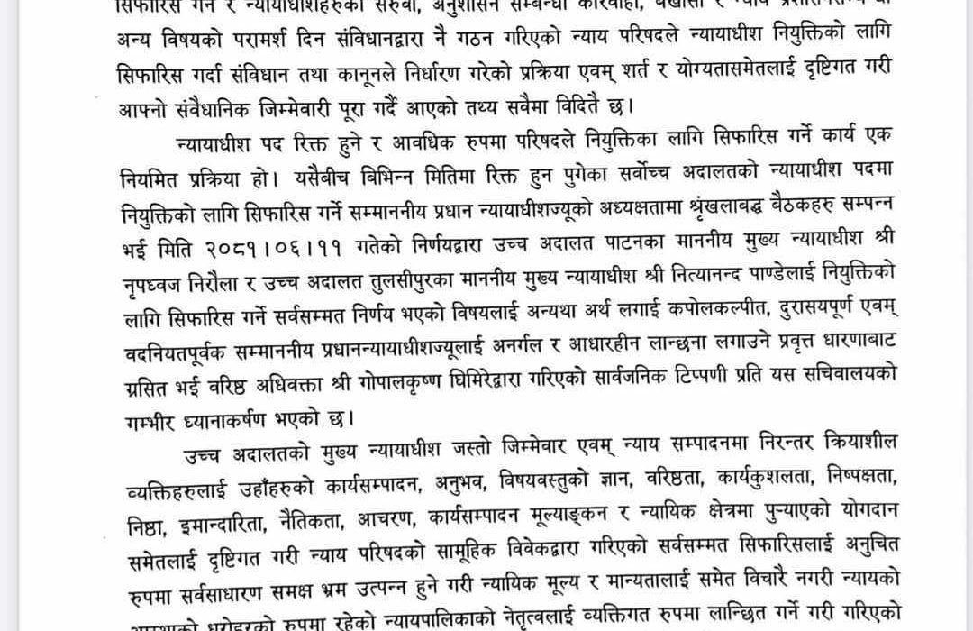 घिमिरेका अभिव्यक्तिलाई लिएर न्याय परिषदको सचिवालयले विज्ञप्तिमार्फत आपत्ती जनाएको छ । सर्वोच्च अदालतको न्यायाधीशमा नृपध्वज निरौला र नित्यानन्द पाण्डेको सिफारिसका विषयलाई लिएर घिमिरेले सार्वजनिक अभिव्यक्ति दिएका थिए ।