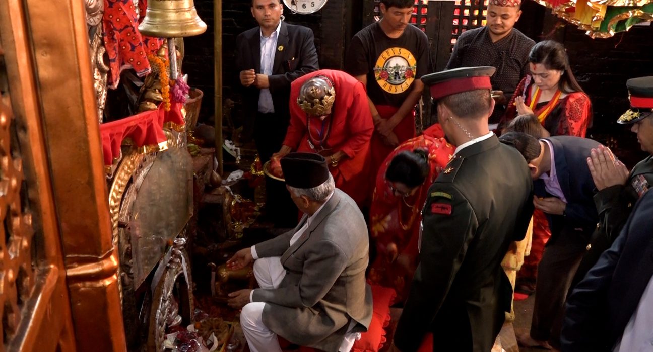 राष्ट्रपति पौडेल धर्मपत्नीका साथ मैतिदेवी मन्दिरमा