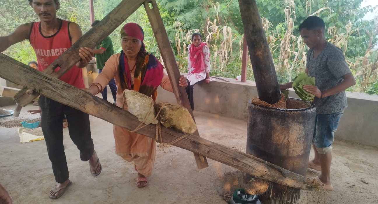 घरको कामबाट फुर्सद निकालेर नजिकैको जङ्गलमा गएर चिउरी टिप्ने गरेको उनले सुनाए । “प्रत्येक वर्ष बिजुला टिप्ने र पेल्ने गर्छौँ, यस वर्ष पाँच मुरी चिउरी टिपेका थियौँ, त्यही पेलेर घ्यू बनाउँदैछौँ”, गिरीले भने । जङ्गलमा खेर गइरहेको चिउरीको दाना पेलेर घरमै घ्यू उत्पादन गर्दैआएको उनले बताए ।