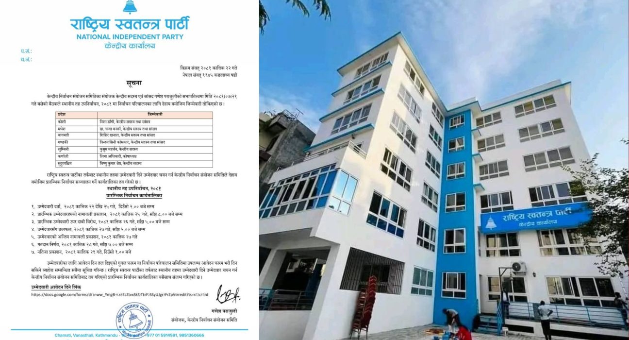 २२ कात्तिक, काठमाडौं । राष्ट्रिय स्वतन्त्र पार्टी (रास्वपा)ले आगामी मंसिर १६ गते हुने स्थानीय तहको उपनिर्वाचनको कार्यतालिका सार्वजनिक गरेको छ ।