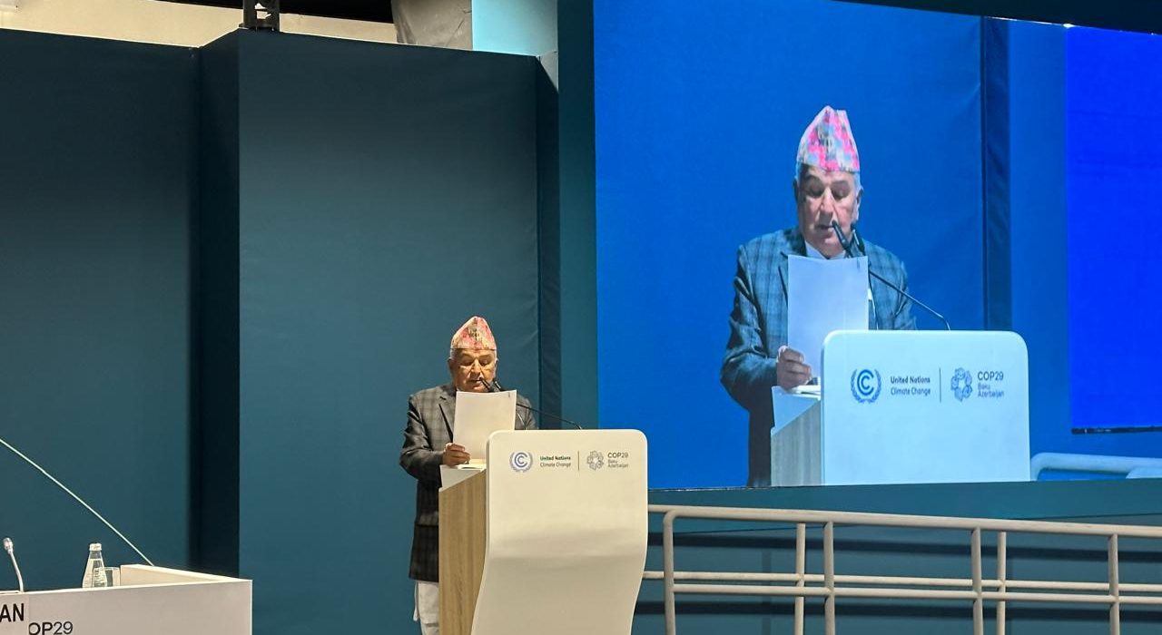 अजरबैजानको बाकु सहरमा यही कात्तिक २६ गतेबाट शुरु भएको जलवायु परिवर्तनसम्बन्धी संयुक्त राष्ट्र संघीय संरचना महासन्धि पक्ष राष्ट्रहरुको २९ औँ सम्मेलन (कोप–२९) अन्र्तगत मङगलबार राष्ट्रपति पौडेलले उच्चस्तरीय सत्रको ‘विश्व नेताहरू जलवायु कार्य शिखर सम्मेलन’लाई सम्बोधन गरेका थिए ।
