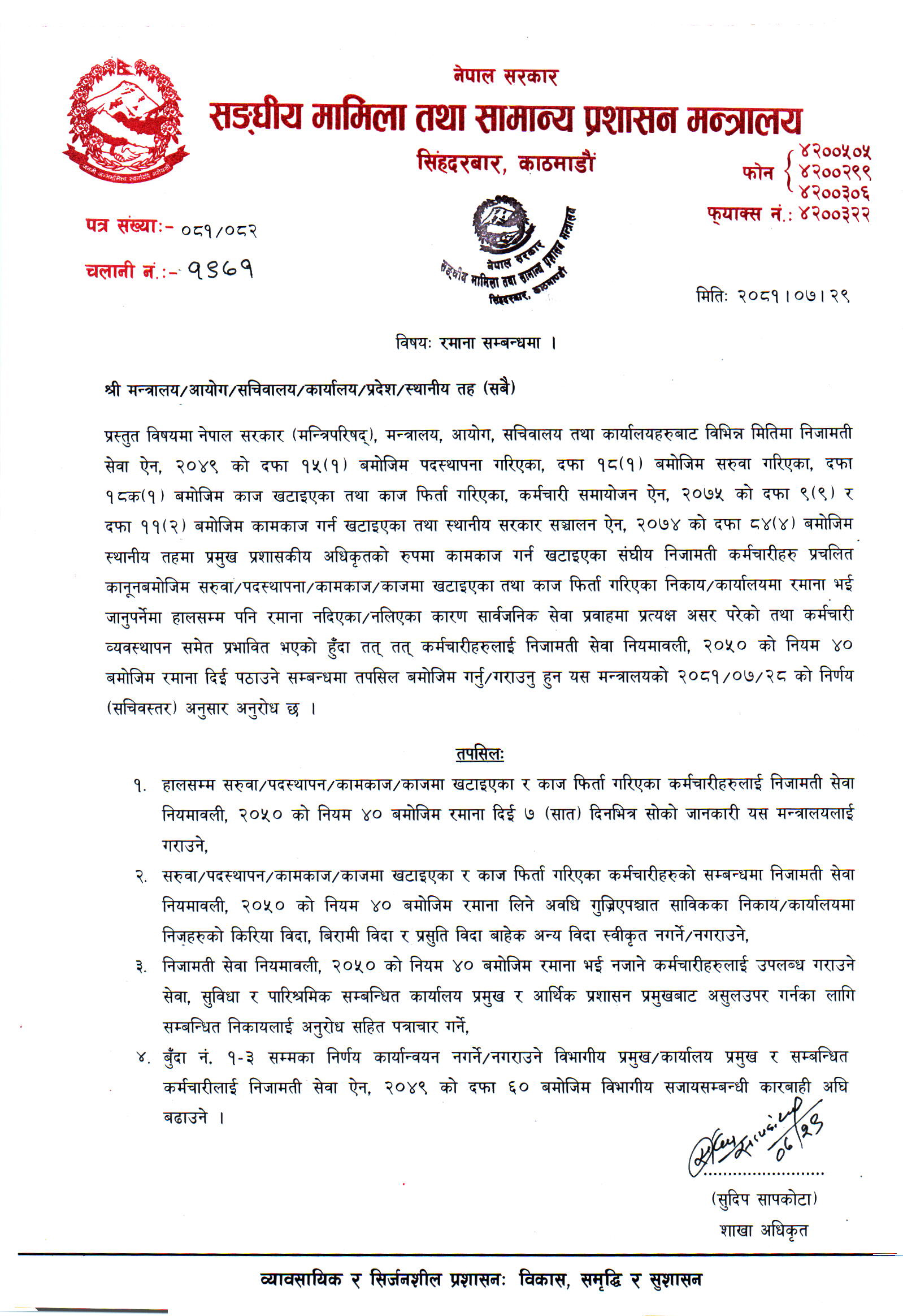‘नेपाल सरकार (मन्त्रिपरिषद्), मन्त्रालय, आयोग, सचिवालय तथा कार्यालयहरूबाट विभिन्न मितिमा निजामती सेवा ऐन, २०४९ को दफा १५ (१) बमोजिम पदस्थापना गरिएका, दफा १८ (१) बमोजिम सरुवा गरिएका, दफा १८क (१) बमोजिम काज खटाइएका तथा काज फिर्ता गरिएका, कर्मचारी समायोजन ऐन, २०७५ को दफा ९(९) र दफा ११(२) बमोजिम कामकाज गर्न खटाइएका तथा स्थानीय सरकार सञ्चालन ऐन, २०७४ को दफा ८४(४) बमोजिम स्थानीय तहमा प्रमुख प्रशासकीय अधिकृतको रूपमा कामकाज गर्न खटाइएका संघीय निजामती कर्मचारीहरू प्रचलित कानूनबमोजिम सरुवा÷पदस्थापना÷कामकाज÷काजमा खटाइएका तथा काज फिर्ता गरिएका निकाय÷कार्यालयमा रमाना भई जानुपर्नेमा हालसम्म पनि रमाना नदिएका÷नलिएका कारण सार्वजनिक सेवा प्रवाहमा प्रत्यक्ष असर परेको तथा कर्मचारी व्यवस्थापन समेत प्रभावित भएको हुँदा तत् तत् कर्मचारीहरूलाई निजामती सेवा नियमावली, २०५० को नियम ४० बमोजिम रमाना दिई पठाउने सम्बन्धमा तपसिल बमोजिम गर्नु÷गराउनु हुन यस मन्त्रालयको २०८१÷०७÷२८ को निर्णय (सचिवस्तर) अनुसार अनुरोध छ,’परिपत्रमा भनिएको छ ।
